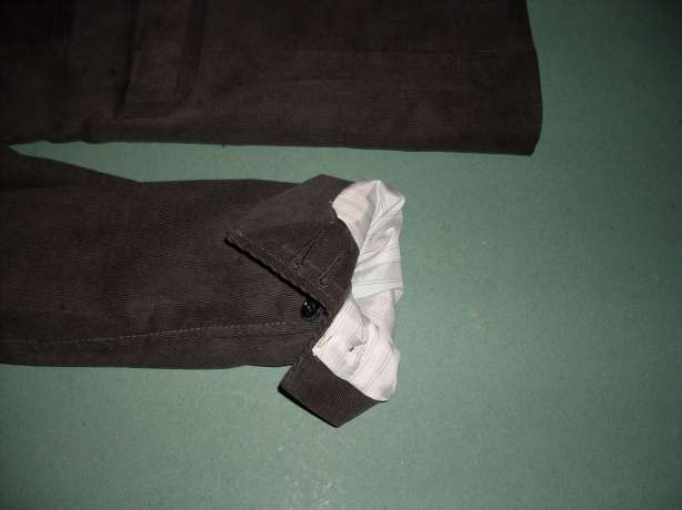–cămăşa bluemarin din catifea (cămașa are cotiere maro și dacă întorci manșeta, este un imprimeu interesant care este prezent și pe guler);